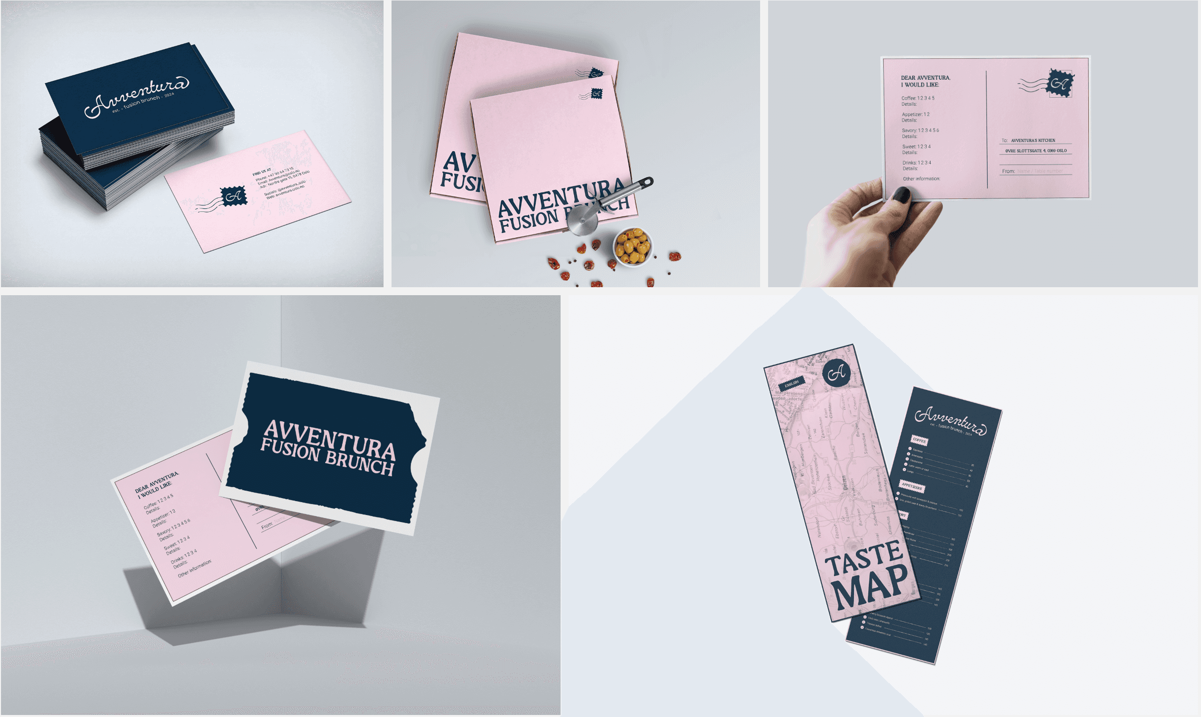 Som en del av emnet «Portfolio og bransjekunnskap», var oppgaven å gjennomføre et selvvalgt prosjekt med full kreativ frihet. Min oppgave var derfor ikke bare å designe, men å utvikle et komplett konsept fra bunnen av, basert på historiefortelling og personlig inspirasjon. Resultatet ble «Avventura» – et konsept for en italiensk fusion-brunch, inspirert av egne erfaringer med mat, reise og kulturutveksling. Målet var å bygge en helhetlig visuell identitet som forteller en historie, forankret i verdiene unik, kreativ og kvalitet.