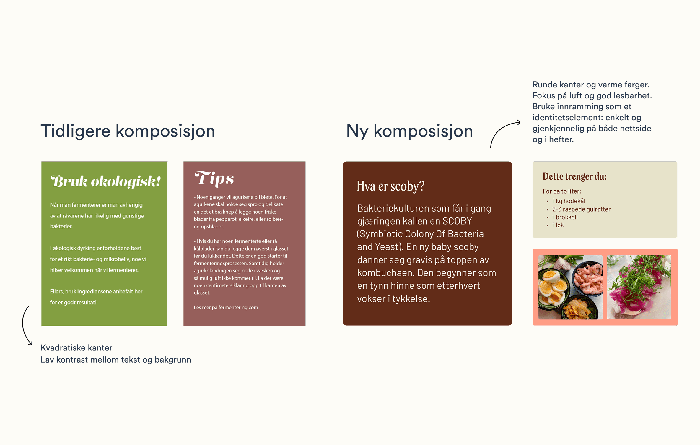 Den nye visuelle identiteten er utviklet for å fremstå varm, tydelig og fleksibel, med et uttrykk som fungerer like godt på nettsiden som i kurs og oppskriftshefter. Målet var å gjøre fermentering mer inviterende og matgledefylt, samtidig som profilen skulle oppleves profesjonell og lett å bruke i ulike flater.