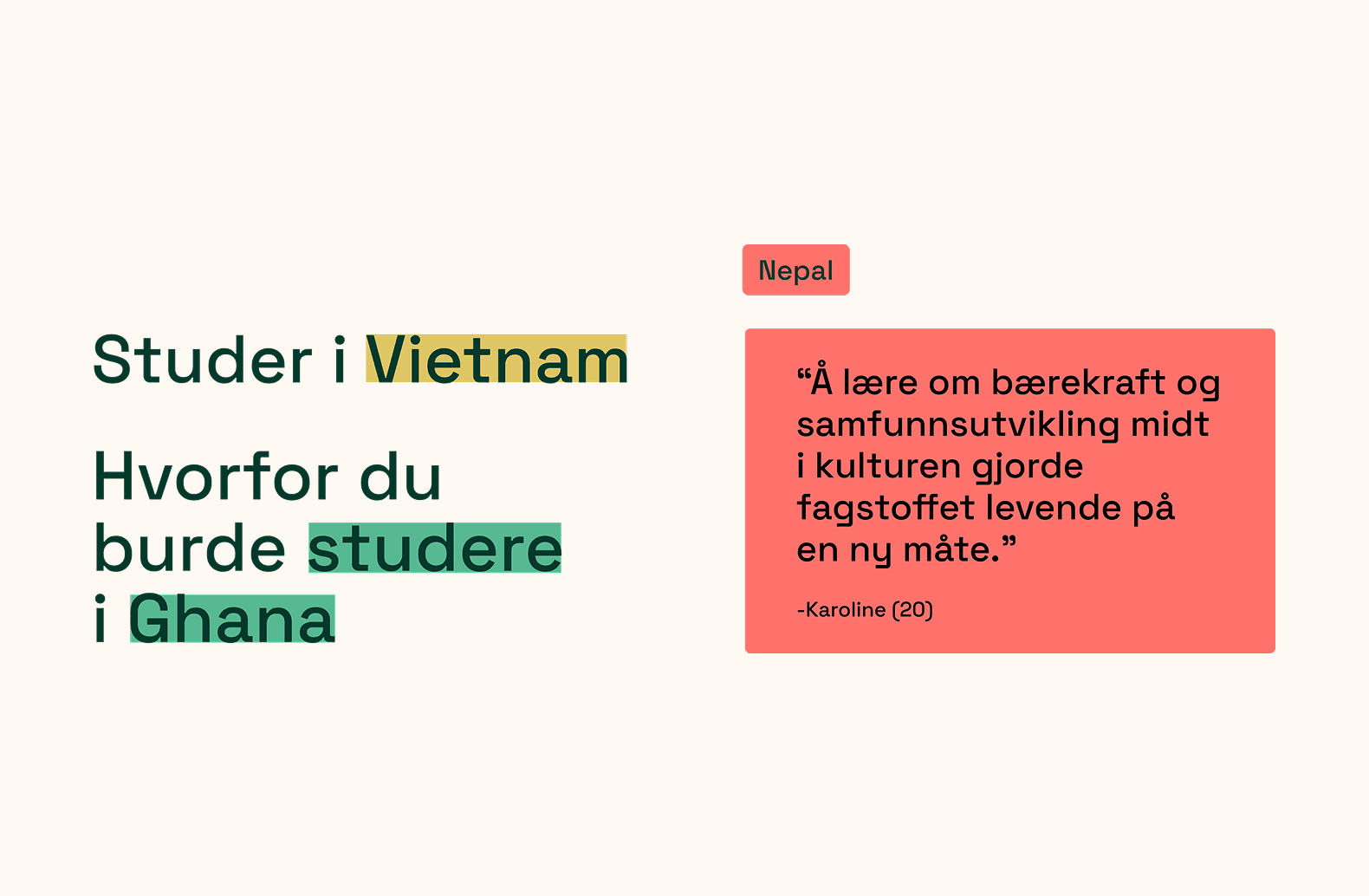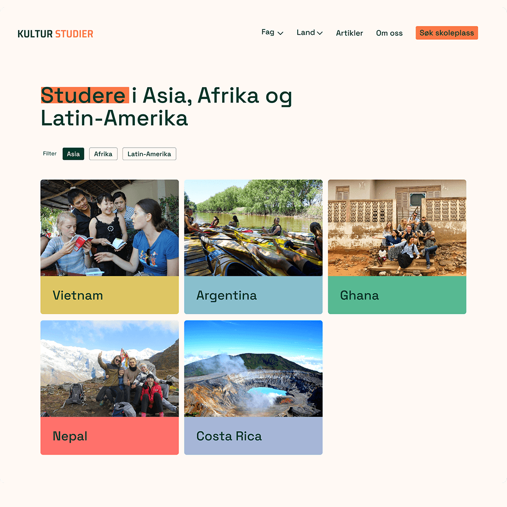 Som lærling fikk jeg i oppdrag å utvikle en konseptuell retning for Kulturstudiers nye visuelle identitet. Organisasjonen tilbyr utenlandsstudier i Asia, Afrika og Latin-Amerika, og trengte et tydeligere, mer tillitsvekkende uttrykk som gjorde informasjonen lettere tilgjengelig for potensielle studenter. Konseptet mitt, som la vekt på klarhet, troverdighet og internasjonalt engasjement, ble valgt og videreutviklet til en komplett visuell identitet.