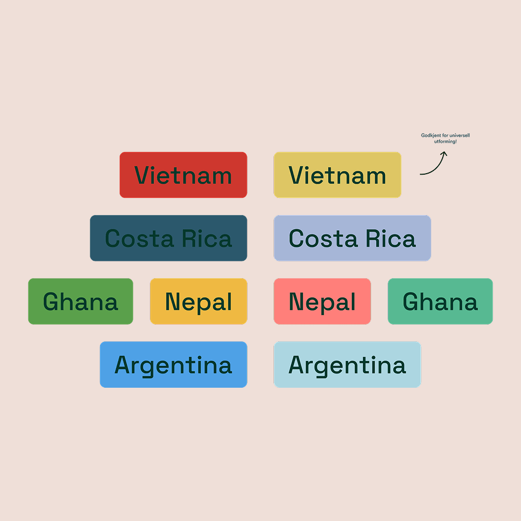 Fargepaletten er inspirert av landenes flagg og tilpasset for universell utforming. Dette forsterker både kulturell tilhørighet og gir navigasjonen et funksjonelt løft. Runde hjørner og myke farger virker trygghetsskapende, mens realistiske bilder av studenter og hverdagsliv gir et troverdig og gjenkjennelig inntrykk.