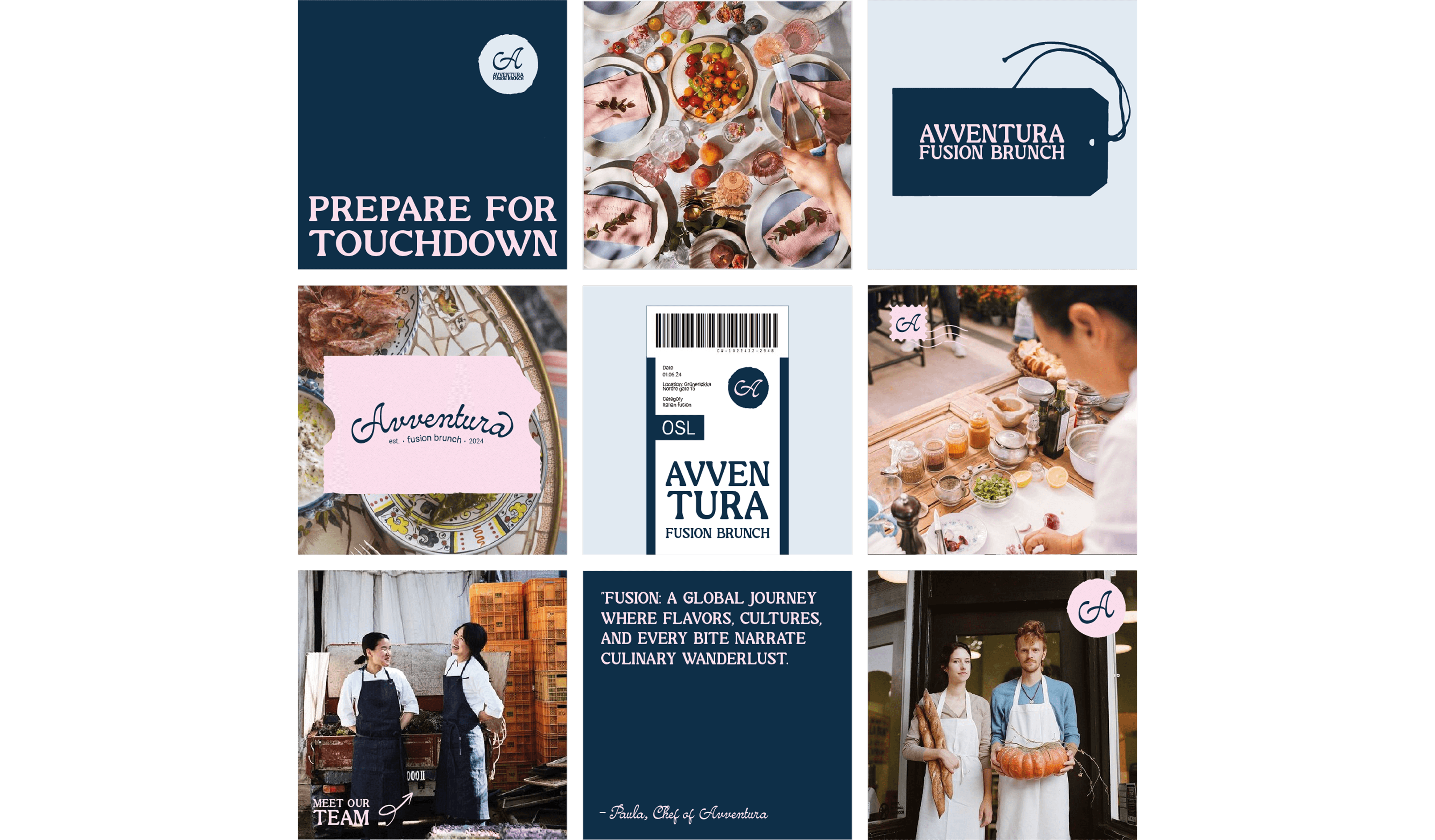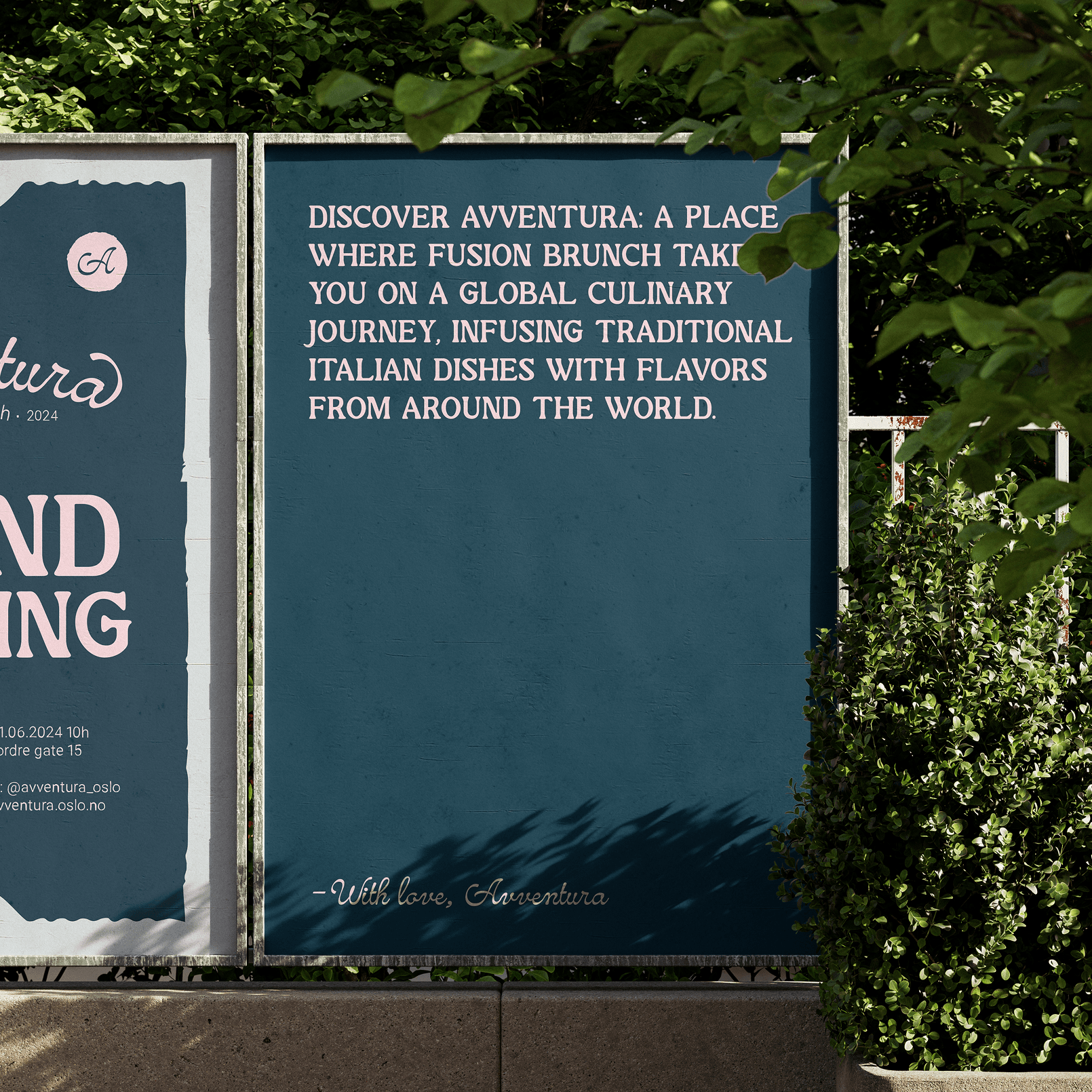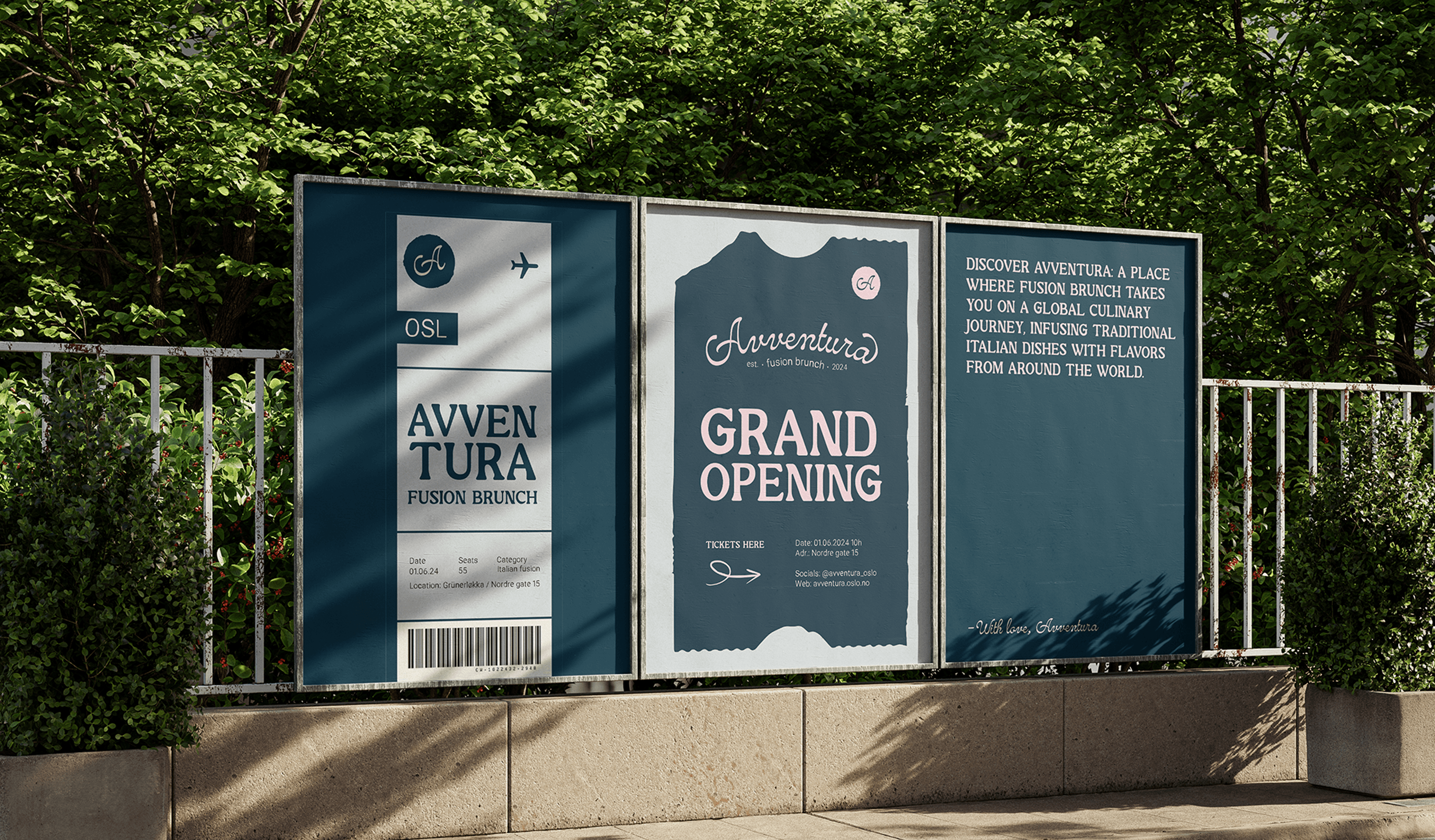 Som en del av emnet «Portfolio og bransjekunnskap», var oppgaven å gjennomføre et selvvalgt prosjekt med full kreativ frihet. Min oppgave var derfor ikke bare å designe, men å utvikle et komplett konsept fra bunnen av, basert på historiefortelling og personlig inspirasjon. Resultatet ble «Avventura» – et konsept for en italiensk fusion-brunch, inspirert av egne erfaringer med mat, reise og kulturutveksling. Målet var å bygge en helhetlig visuell identitet som forteller en historie, forankret i verdiene unik, kreativ og kvalitet.