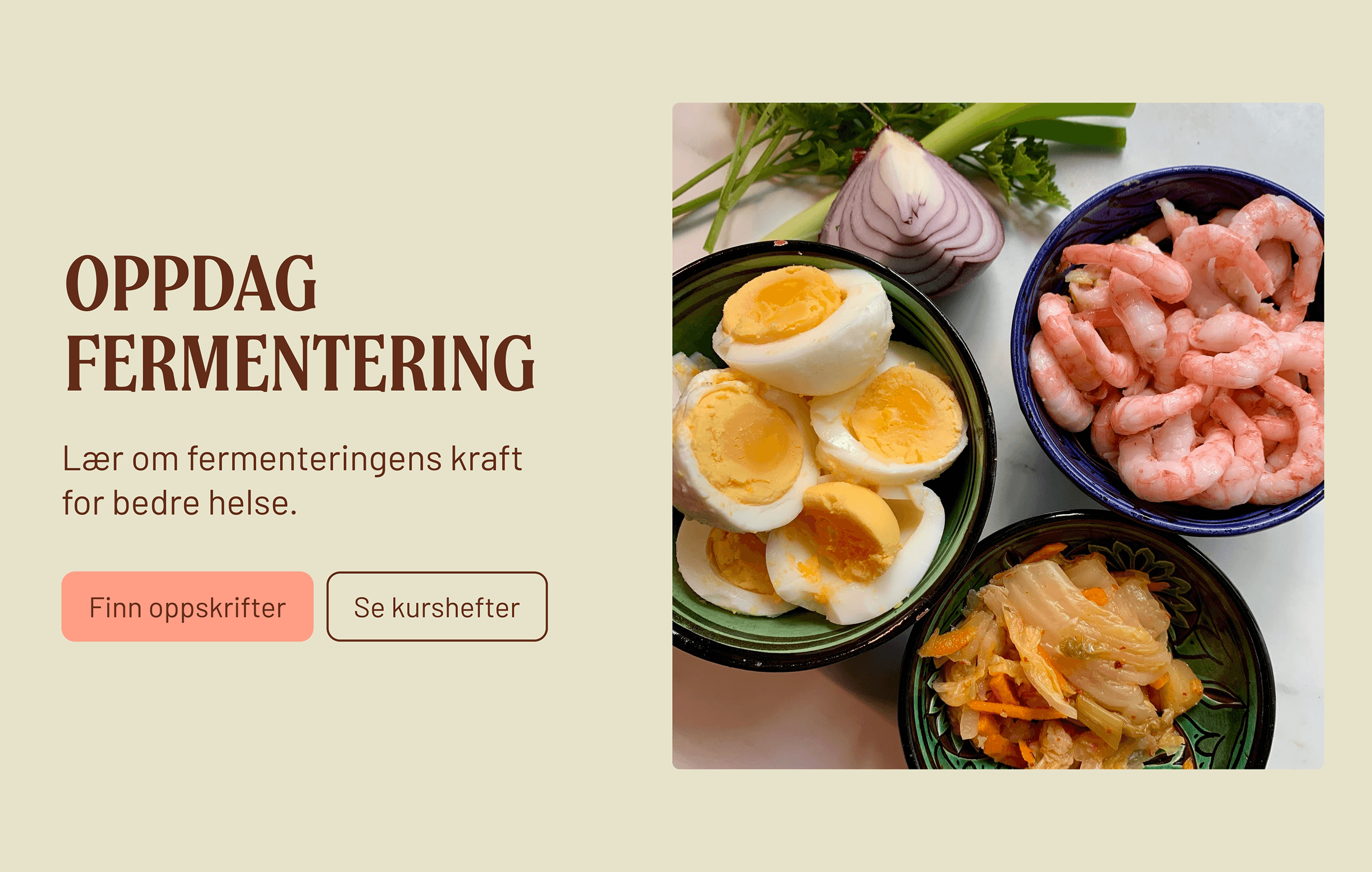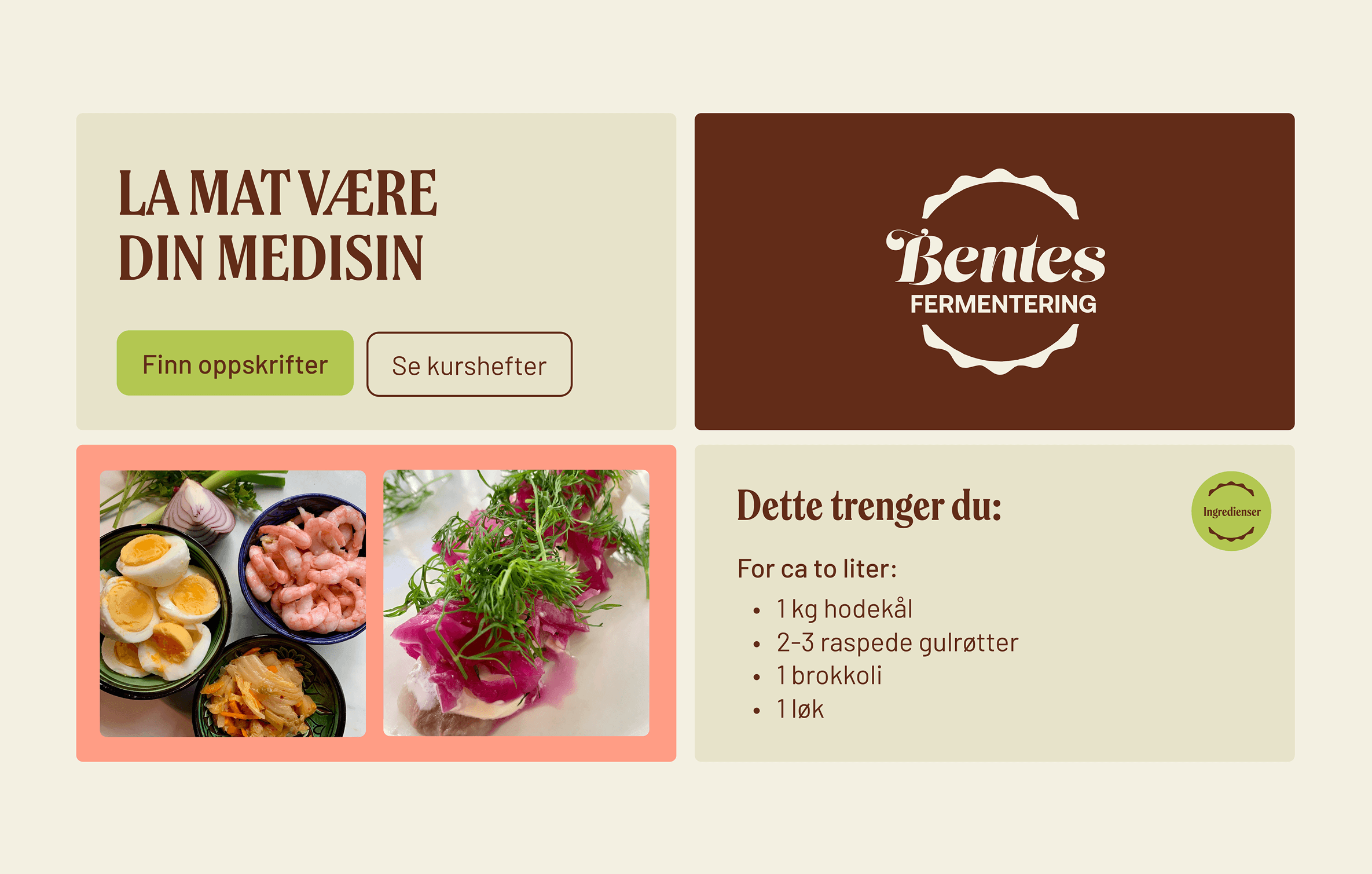 Bentes fermentering formidler gleden ved fermentert mat – og ønsket en merkevare som speilet den samme varmen, kunnskapen og livsgleden som Bente selv står for. Som lærling i Kult Byrå fikk jeg ansvar for å utvikle en helhetlig løsning med redesign av visuell identitet, oppgradert nettside i Squarespace og nytt oppskriftshefte med Sanity-integrasjon. Resultatet ble et friskere og mer tidsaktuelt uttrykk som gjør det enklere å inspirere flere til en sunnere livsstil.