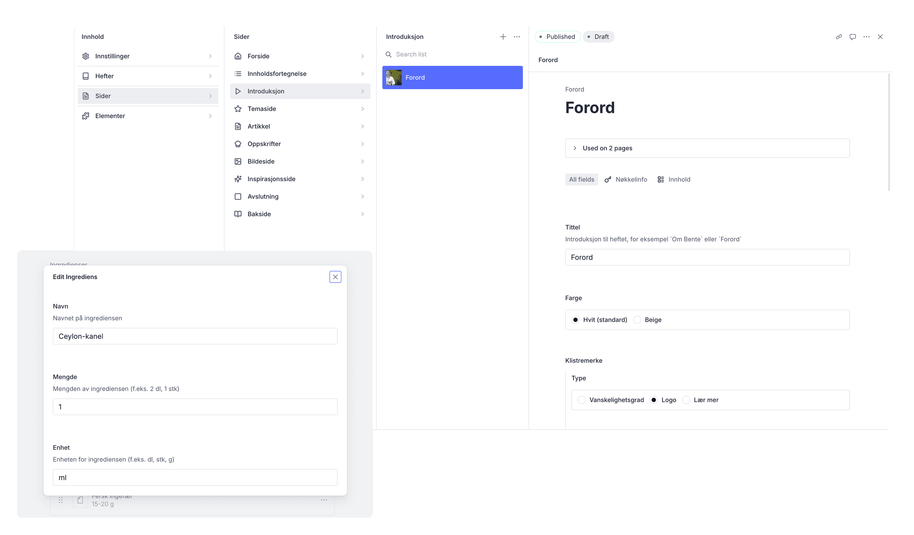 Resultatet er et schema hvor Bente kan bygge hvert hefte modul for modul, legge inn tekst direkte og kombinere sider til komplette hefter. Valideringsregler holder tekstlengder i sjakk, samtidig som hun kan velge fargekombinasjoner som alltid følger universelle designprinsipper. Dette gir en fleksibel og effektiv arbeidsflyt, samtidig som Bente beholder full redaksjonell kontroll.