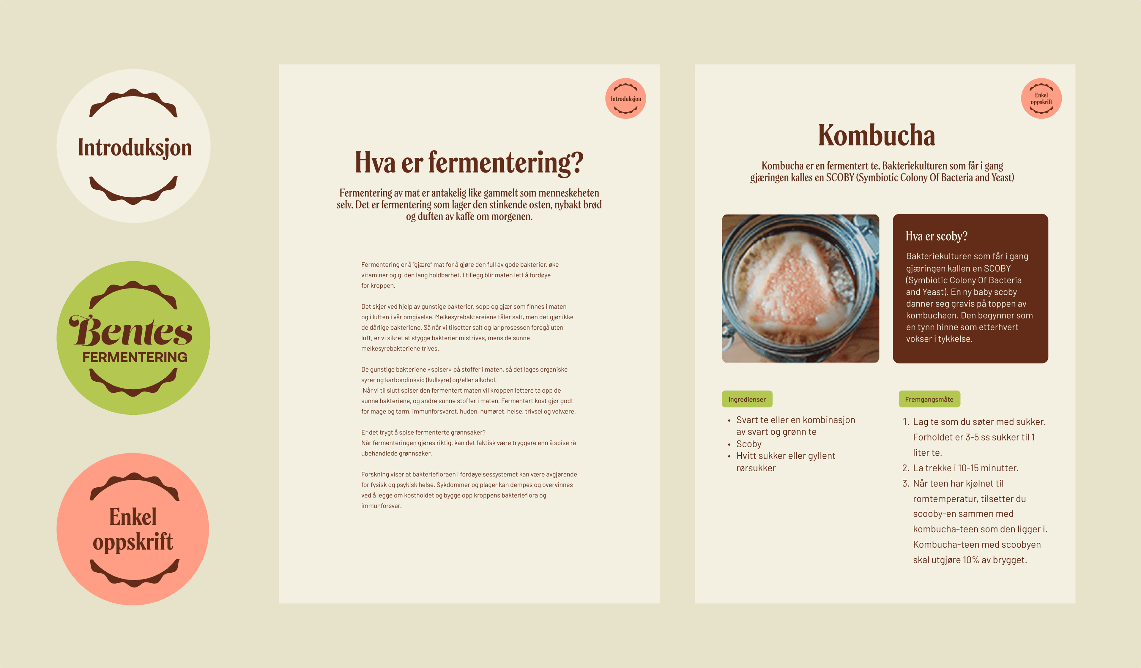 Logoen er forenklet for å bevare særpreget også i små formater, mens layouten organiseres i tydelige faktabokser som skaper struktur og ro – særlig i oppskriftsheftet. Fargepaletten henter inspirasjon fra fermenterte råvarer og tilfører energi og liv, mens typografien gir et moderne og lesbart uttrykk, med gode bokstavformer for Æ, Ø og Å.