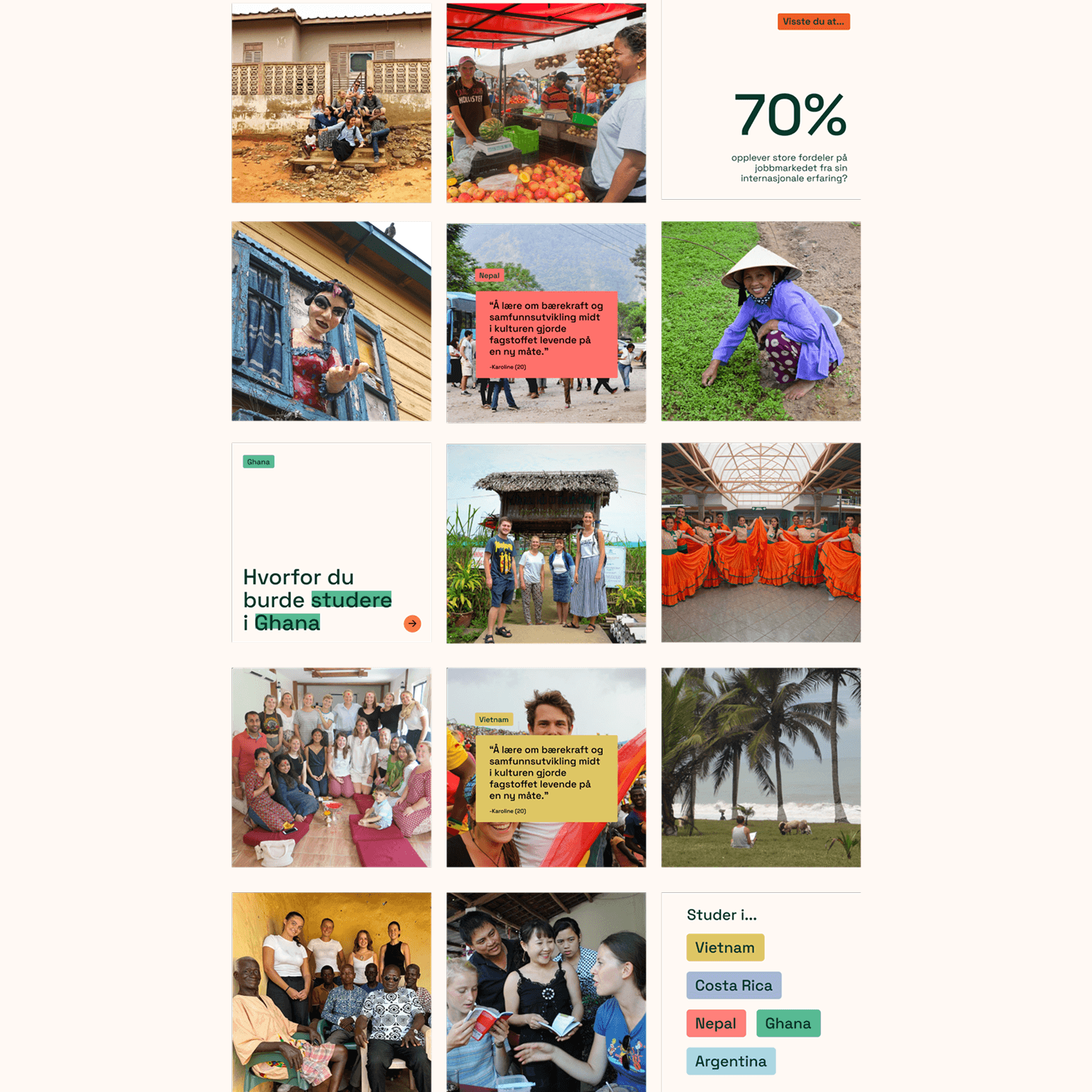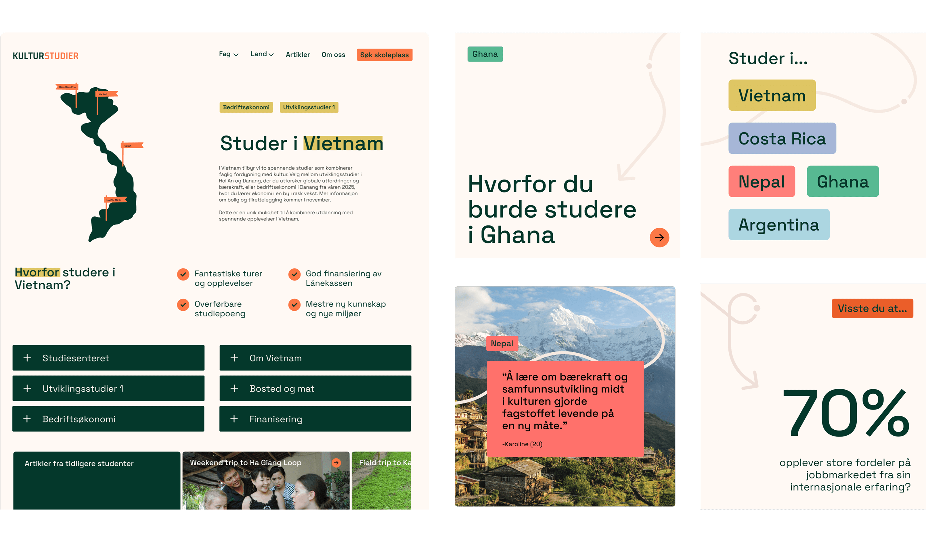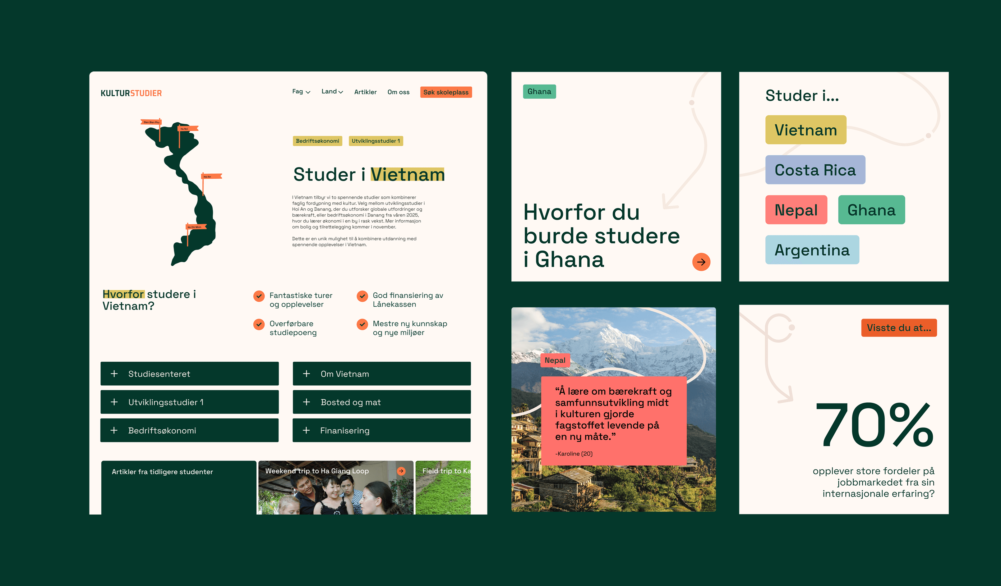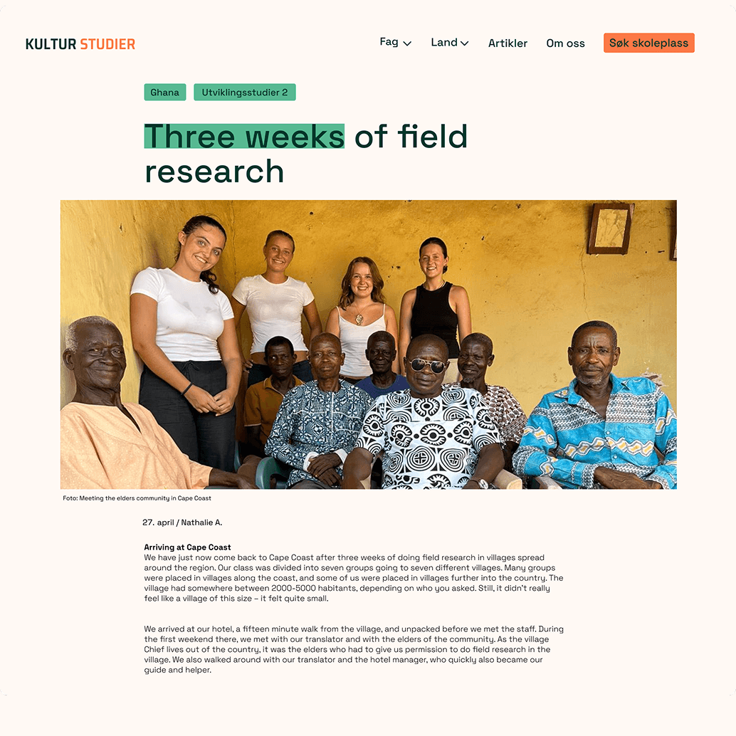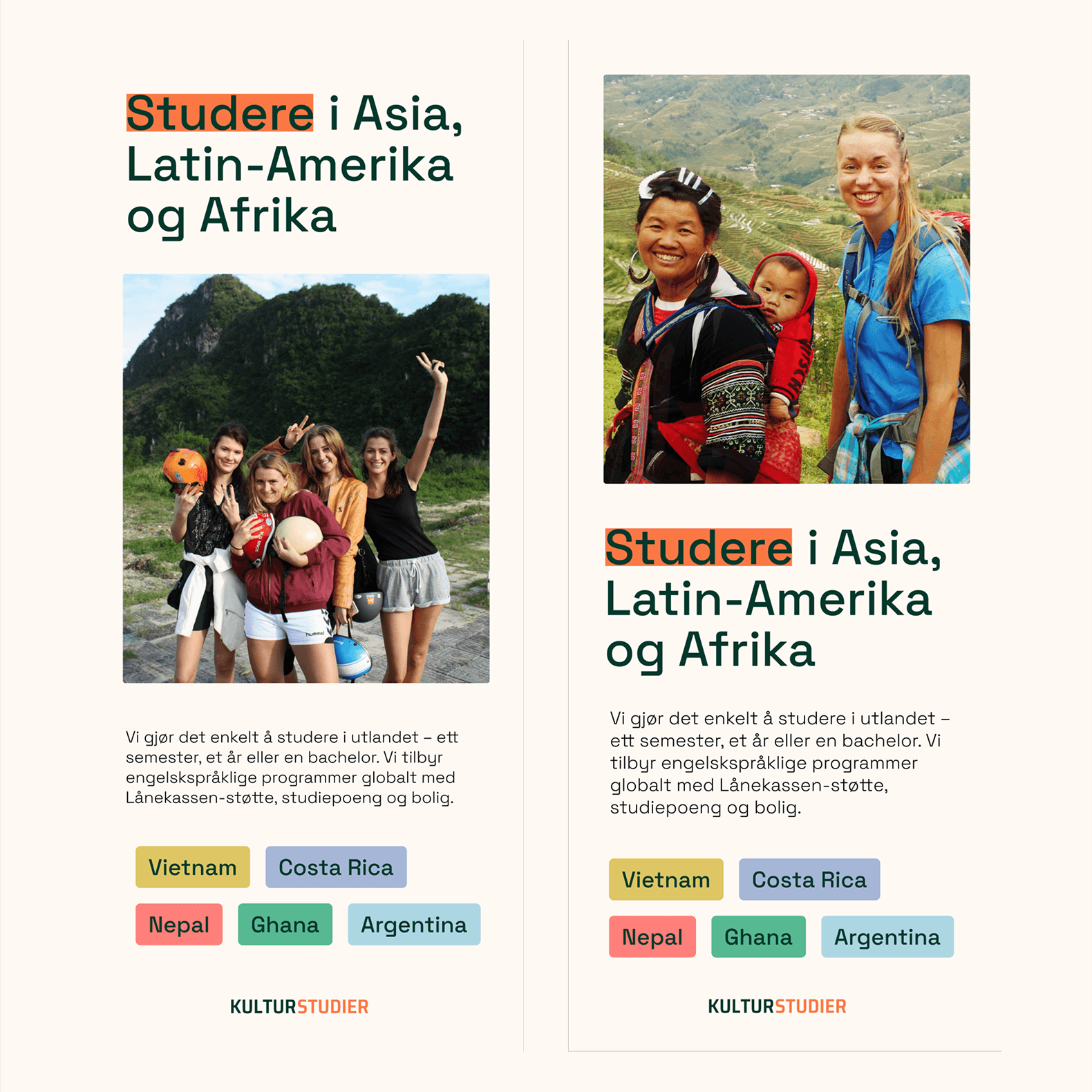 Som lærling fikk jeg i oppdrag å utvikle en konseptuell retning for Kulturstudiers nye visuelle identitet. Organisasjonen tilbyr utenlandsstudier i Asia, Afrika og Latin-Amerika, og trengte et tydeligere, mer tillitsvekkende uttrykk som gjorde informasjonen lettere tilgjengelig for potensielle studenter. Konseptet mitt, som la vekt på klarhet, troverdighet og internasjonalt engasjement, ble valgt og videreutviklet til en komplett visuell identitet.