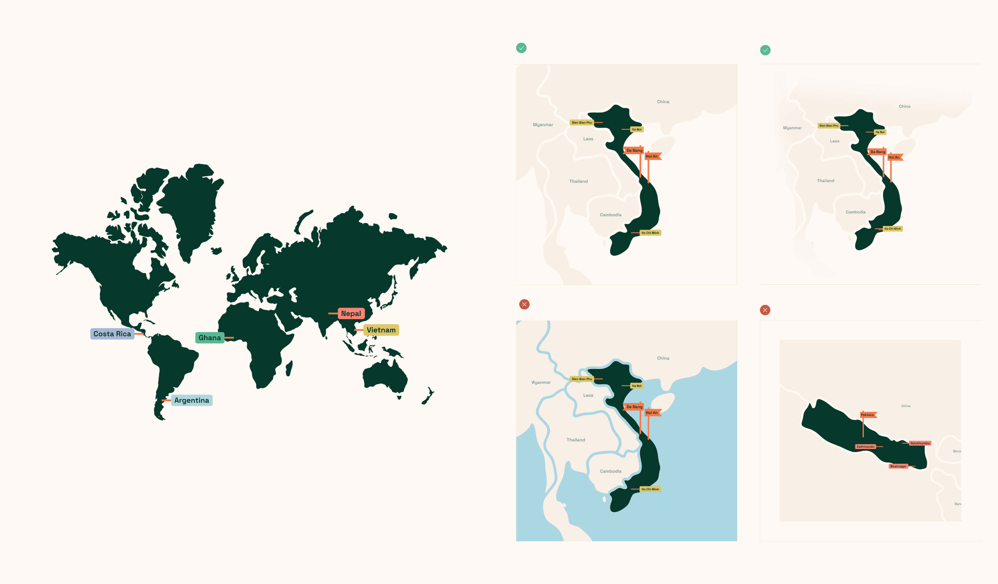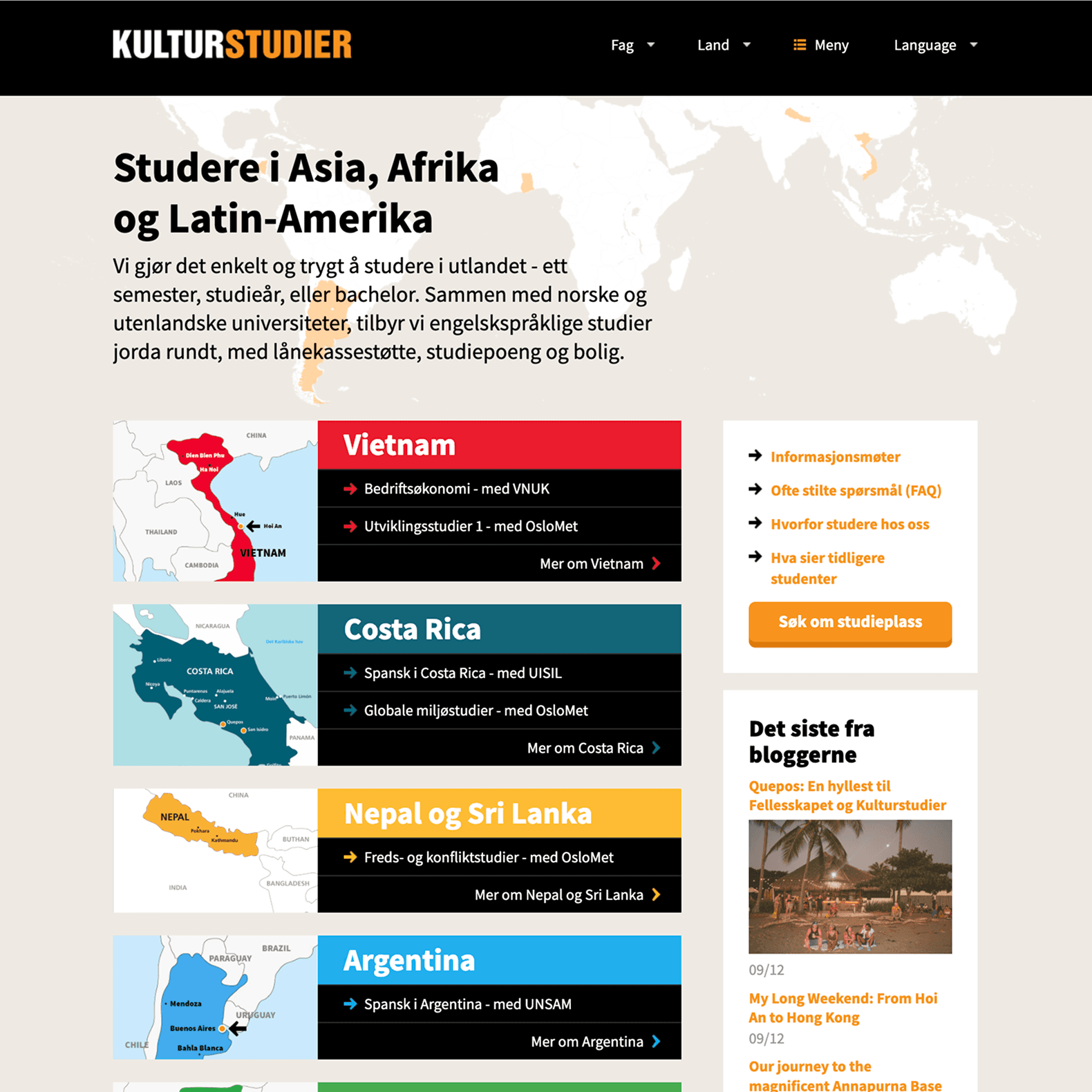 En annen leveranse for Kulturstudier har vært kart i samme stil som den nye visuelle identiteten. Kartene viser både et verdenskart og studieland, med markører for studiesteder og større byer eller hovedsteder.