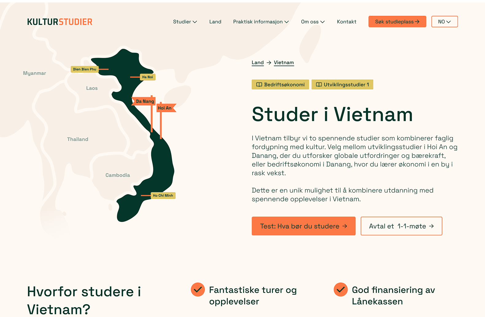 Oversiktlige moduler med fargede rammer organiserer innholdet og gjør viktig informasjon enkel å finne, noe som motvirker informasjonsoverbelastning. Moderne, ryddig typografi og helhetlig struktur understreker det akademiske og sikrer at Kulturstudier oppleves som en seriøs, tilgjengelig og relevant aktør for målgruppen.